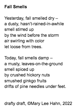 We focus on visual imagery so often — I love that this poem is all about smells. The crushed hickory nuts and pine needles are like a walk in an autumn forest.