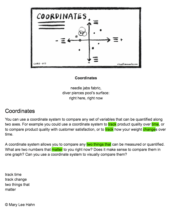 My first drafts explored all the possible ways to use a framework. For Coordinates, I wrote a haiku based on the image, then an erasure poem from the text.