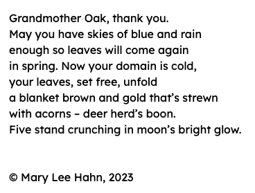 I am intrigued by this form and can’t wait to give it a try. I especially like how you addressed the oak tree in your first poem. Thank you for this gift today.