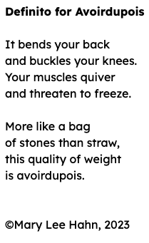 6. Hahahaha your weighty poem is en”lighten”ing! Hey, my definition of free verse includes that you are free to rhyme if that’s what floats the boat. I love this. Did you see what avoirdupois actually MEANS in French? “to have of weight” or “goods sold by weight.” Good old ProtoIndoEuropean roots!