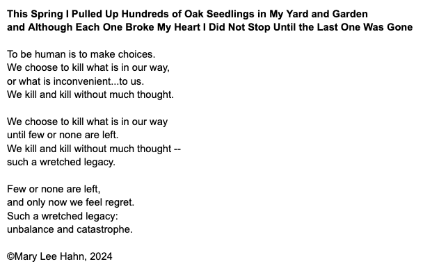 I know that our oak and our neighbors’ oaks send way more acorns out into the world than could ever possibly survive (even if this were a forest and not a neighborhood). I do not mourn all the possible oak trees that were eaten by squirrels and deer or that fell on pavement and rolled away down the street. But I do mourn the ones whose brief lives I ended with my weeding fork.
