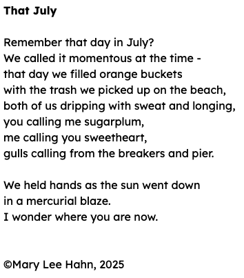 Here’s another poem from the MoSt challenge. (Last week’s was, too.) This one was in response to challenge #14: Use orange, momentous, bucket, sweetheart, sweat, and longing. Mercurial was the bonus word. It was fun to write a poem that was entirely fictional!
