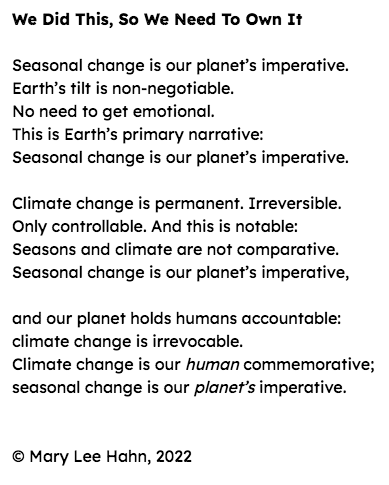 My first drafts were odes to Autumn. Somewhere along the line, my repeating line showed up and the rest just…flowed. Our planet just keeps doing what it’s tilted to do, and all of the changes we’ve made in its/our climate are irreversible. There’s no going back. A hard truth to swallow as we (hopefully, with votes galore) work to put on the brakes and do less damage moving forward.