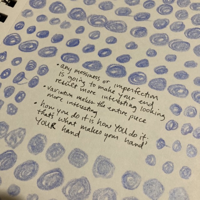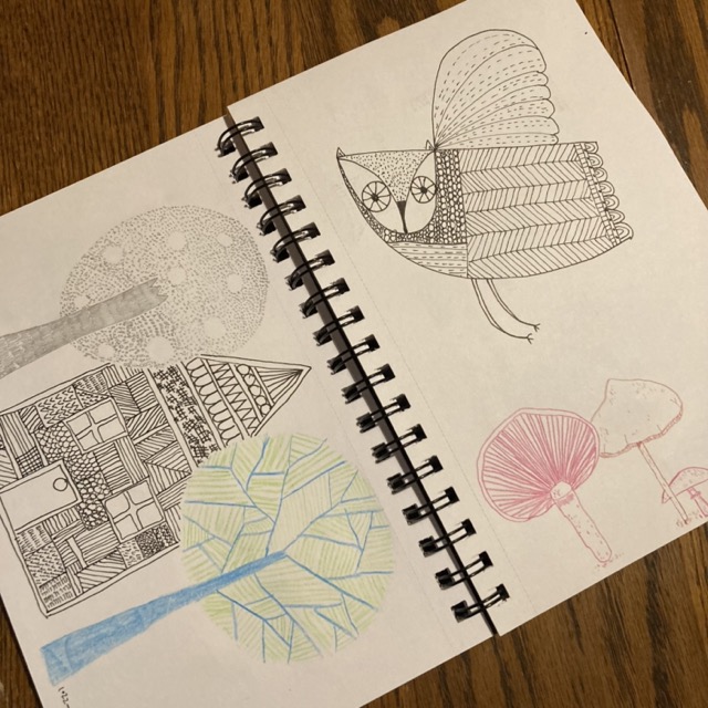 Throughout the course, I’ve often copied her lesson and then “riffed” on it by trying it with watercolor instead of colored pencil, or by combining lessons when I didn’t have the energy for a whole-page design.
