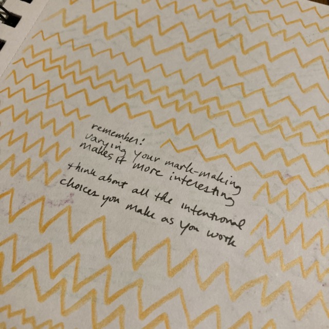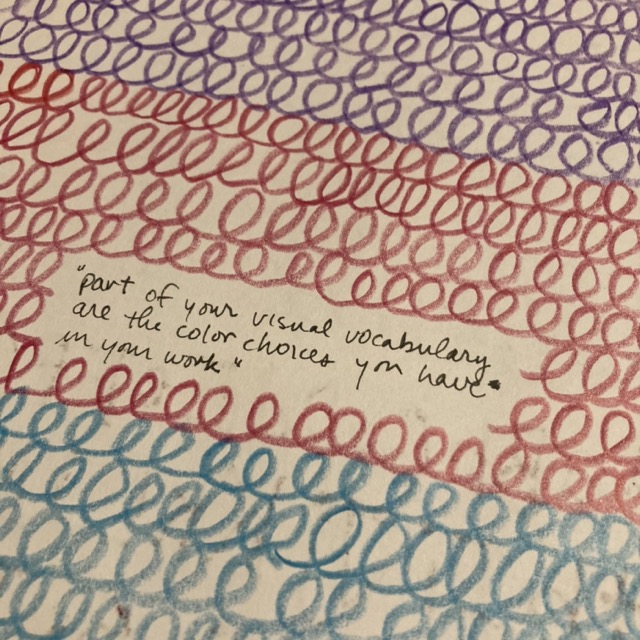 This wisdom can inform mark making with colored pencils, watercolor, thread, or words on a page: the importance of practice, the acceptance (or even cultivation) of wonkiness (she used the word “wonky” a LOT and it made me love her even more every time), and the development of your own particular VOICE.