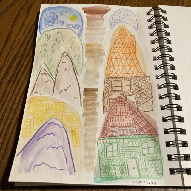 I opened my sketchbook to my blobs of watercolor from last night, and suddenly I could see a village in a valley across the road from mountains with wheat fields and high pastures tucked in between. Without looking back at any of the previous lessons, I chose my colors and made my marks.