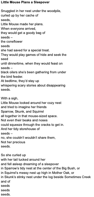 So I had to find another way in. I looked for the farthest thing from my own reality, and came up with a mouse living in a (mostly) fictional woodpile.